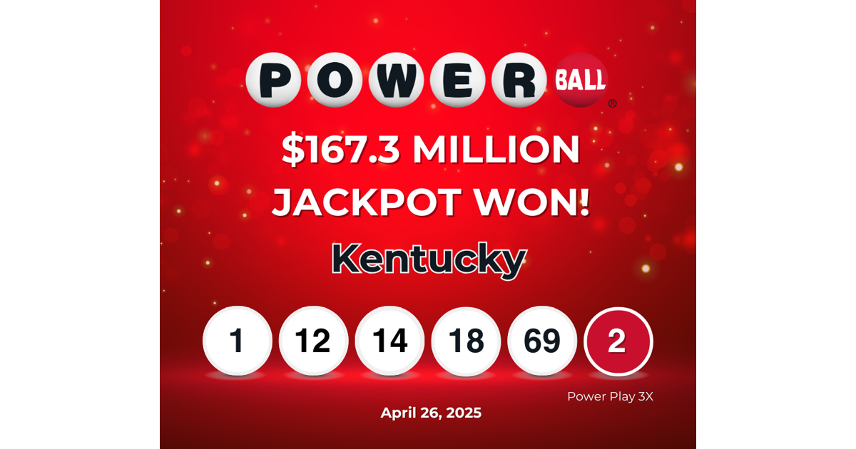 The winning numbers in the Saturday, April 26 Powerball drawing were white balls 1, 12, 14, 18, 69 and red Powerball 2. The Power Play® multiplier was 3X.