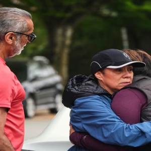 Esperanza Bermudez, centre, who lives across the street from the scene, is comforted by friends Ronnie Claire, right, and Manjit Claire, the morning after a driver killed multiple people during…