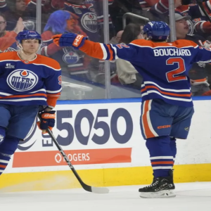 Edmonton Oilers Evan Bouchard (2) celebrates with Corey Perry (90) after Perry scores on the Los Angeles Kings during second-period NHL first-round playoff action on Sunday, April 27, 2025, in…