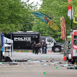 Police officers work the morning after a vehicle was driven into a crowd at a Filipino community Lapu Lapu day block party in Vancouver, on April 27.Chris Helgren/Reuters In the…