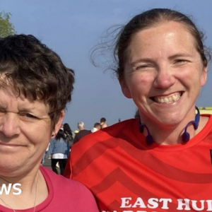 Jess Warren & Tony Grew BBC News BBC Julie Barnes and Debra Harrison from Fit Mums and Friends said their aim was to finish the London Marathon The sun shone…