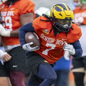 Jan 30, 2025; Mobile, AL, USA; National team running back Donovan Edwards of Michigan (7) runs in drills during Senior Bowl practice for the National team at Hancock Whitney Stadium….
