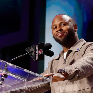 Former New England Patriots running back James White announces the team’s selection with the 95th overall pick during the round of the 2025 NFL Draft on Friday, April 25, 2025,…
