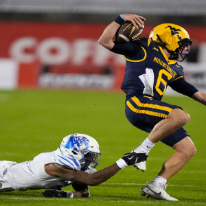 Update Memphis Tigers Football West Virginia quarterback Garrett Greene (6) tries to run out of the grasp of Memphis defensive back Kobee Minor during the Scooters Coofee Frisco Bowl, Dec….