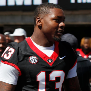 Georgia defensive lineman Mykel Williams (13) arrives with the team before the start of the G-Day spring football game in Athens, Ga., on Saturday, April 13, 2024. / Joshua L….