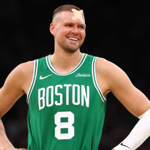 Maddie MeyerBOSTON, MASSACHUSETTS – APRIL 23: Kristaps Porzingis #8 of the Boston Celtics reacts with a bandage on his head against the Orlando Magic during the third quarter in Game…