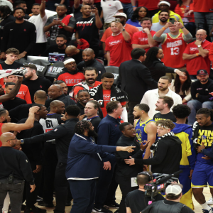 Benches clear between the Houston Rockets and the Golden State Warriors during the fourth quarter in Game 2 of the first round NBA playoff matchup at Toyota Center on April…