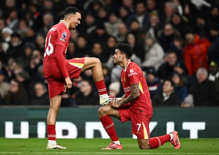 Luis Díaz celebrates with Trent Alexander-Arnold after opening the scoring in Liverpool’s rampant, Klopp-like 6-3 victory at Tottenham. Photograph: Dylan Martinez/Reuters