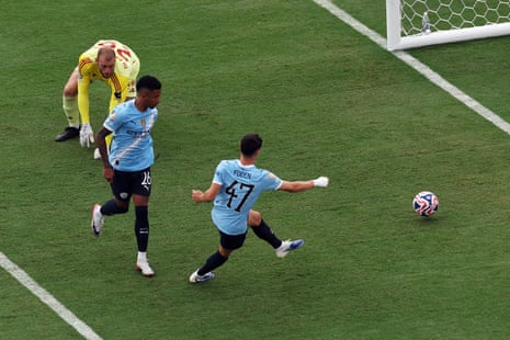 73 min: Foden drops deep to play quarterback. When 80 miles from Tampa Bay in Rome, etc. He sprays a ball wide left for Savinho. Not quite. Into the stand it goes. Tom Brady used to make this sort of thing look easy, but it’s anything but.