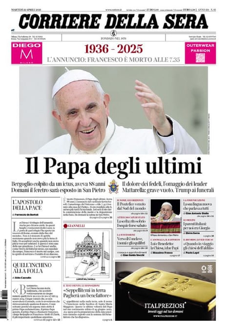 Front page of the Italian Corriere della Sera daily following the death of Pope Francis, as printed on 22 April 2025. Photograph: Corriere della Sera