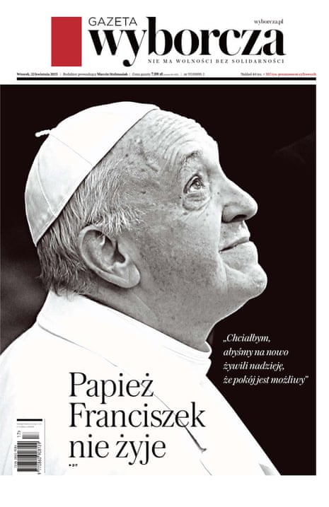 Front page of the Polish Gazeta Wyborcza daily following the death of Pope Francis, as printed on 22 April 2025. Photograph: Gazeta Wyborcza