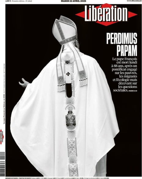 Front page of the French Libération daily following the death of Pope Francis, as printed on 22 April 2025. Photograph: Libération