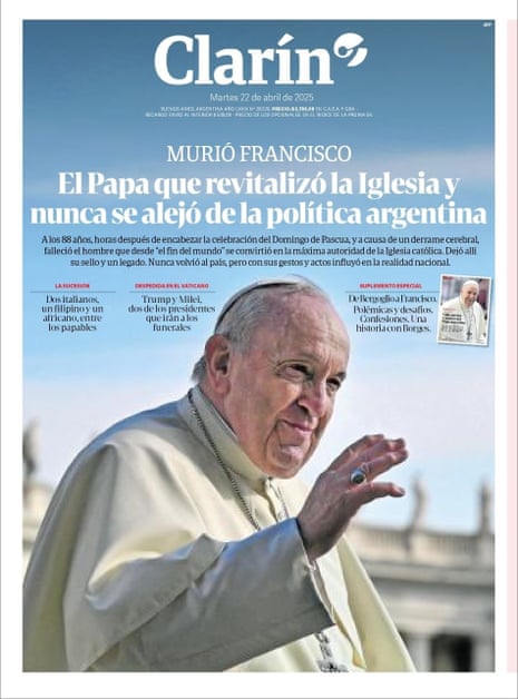 Front page of the Argentinian Clarín daily following the death of Pope Francis, as printed on 22 April 2025. Photograph: Clarín