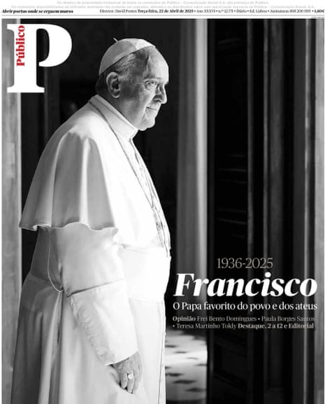 Front page of the Portuguese Publico daily following the death of Pope Francis,as printed on 22 April 2025. Photograph: Publico