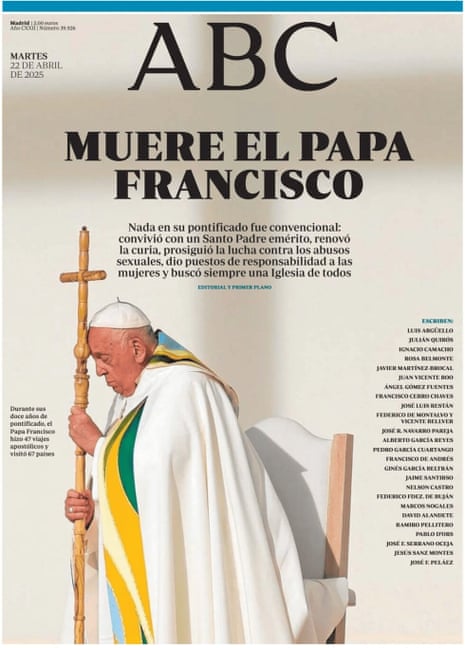 Front page of the Spanish ABC daily following the death of Pope Francis, as printed on 22 April 2025. Photograph: ABC