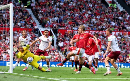 West Ham’s Alphonse Areola makes a diving save from Manchester United’s Rasmus Højlund. Photograph: Marc Atkins/Getty Images