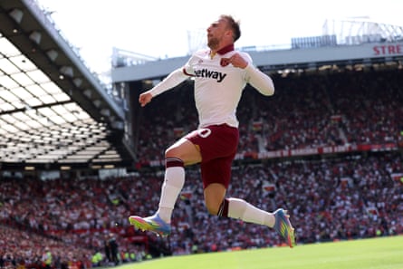 Jarrod Bowen jumps for joy after scoring West Ham’s second goal. Photograph: Alex Livesey/Getty Images