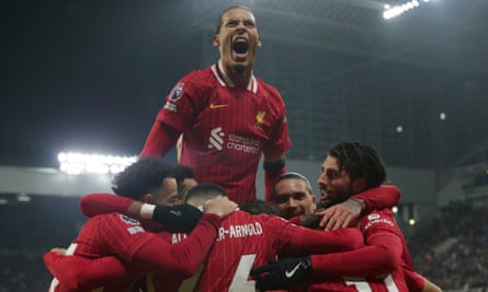 Virgil van Dijk – celebrating a Mohamed Salah goal against Newcastle in December – has assumed greater authority on and off the pitch. Photograph: Ian Hodgson/AP