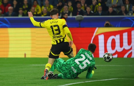 9 min: Penalty to Dortmund! It’s been coming. Gross runs onto Adeyemi’s pass and is brought down by Szczesny, a daft challenge with Gross moving away from goal. There’s a check for offside but Gross timed his run nicely.
