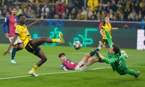 Barcelona’s goalkeeper Wojciech Szczesny (right) saves a shot by Dortmund’s Serhou Guirassy (left). Photograph: Matthias Schräder/AP