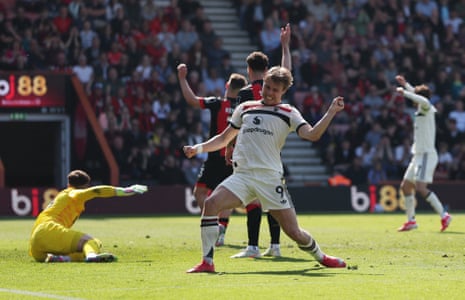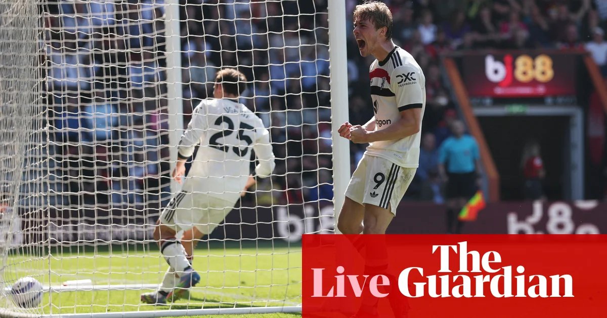 Time for me to go and find a banana. John Brewin’s match report from the South Coast will be with you soon. All eyes are now on Anfield, where even the air has turned red. Do join Simon Burnton to see if Liverpool can grab the point they need to seal their 20th league title. Thanks for your company, correspondence and forthright views on Ruben Amorim. He can, at least, be relieved that Rasmus Hojlund has scored a goal, for only the fourth time in the league this season.
