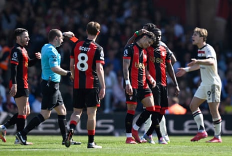 “That red card,” says Andy Flintoff, “was similar to one for Fernandes earlier in the season, which was reduced on appeal as he slipped too. It doesn’t help Bournemouth now, of course.”