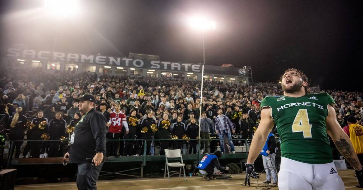 Sacramento State running back Cameron Skattebo (4) cheers on the Hornets defense with the home crowd as they play in the final minutes against Incarnate Word (Texas) at the NCAA college football FCS playoffs quarterfinal game in 2022 at Hornet Stadium in Sacramento. Skattebo is projected to be selected in the 2025 NFL draft. Xavier Mascareñas Sacramento Bee file