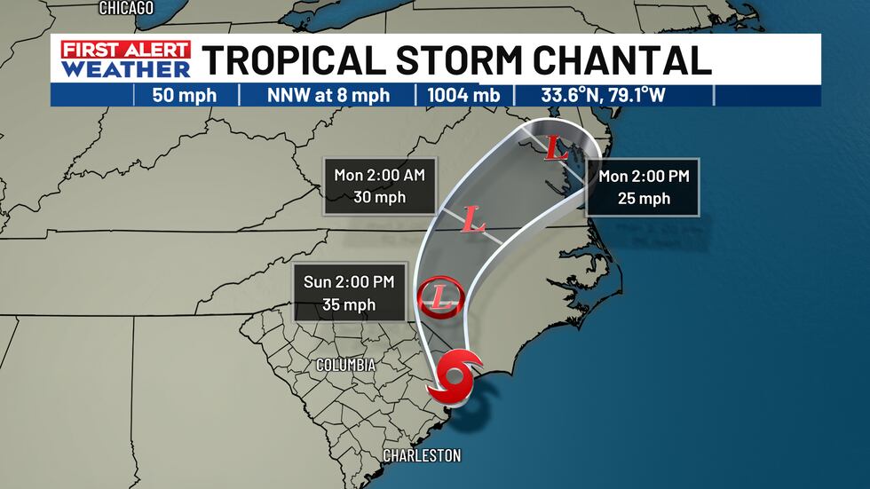 - Chantal to bring breezy winds and tropical downpours to the Midlands this morning, mainly for parts of Kershaw, Sumter, Lee, Clarendon, Calhoun, and Orangeburg counties.