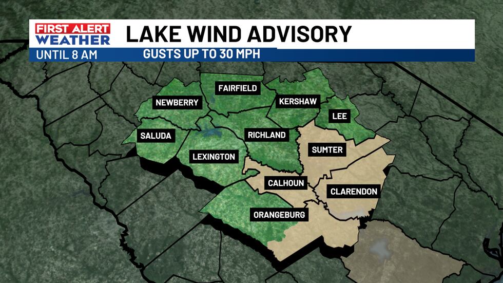 A Lake Wind Advisory is in effect until 8 am for our easternmost counties as winds there could gust to as high as 30 mph until about mid-morning.