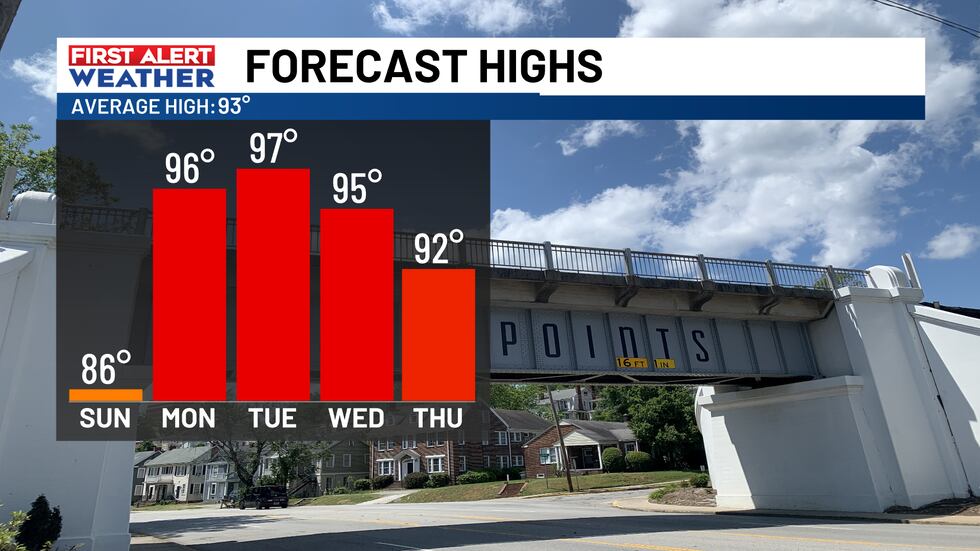 Monday: Mostly sunny. High temperatures warming up to the middle 90s.