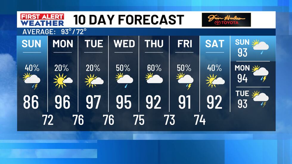 Wednesday: 50% chance of scattered showers and storms. Highs in the middle 90s.