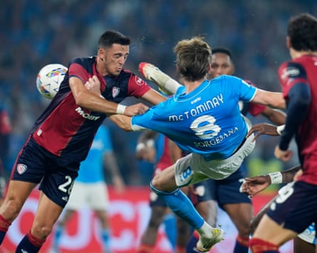 Scott McTominay scores Napoli’s first goal against Cagliari with a sensational scissor-kick. Photograph: Matteo Ciambelli/Reuters