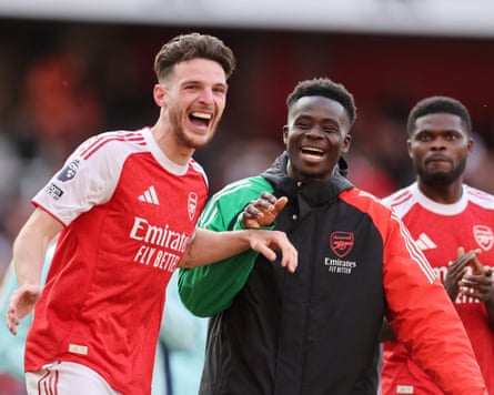 Declan Rice (left) and Bukayo Saka (centre) are all smiles after the match during a lap of appreciation. Photograph: David Klein/Reuters