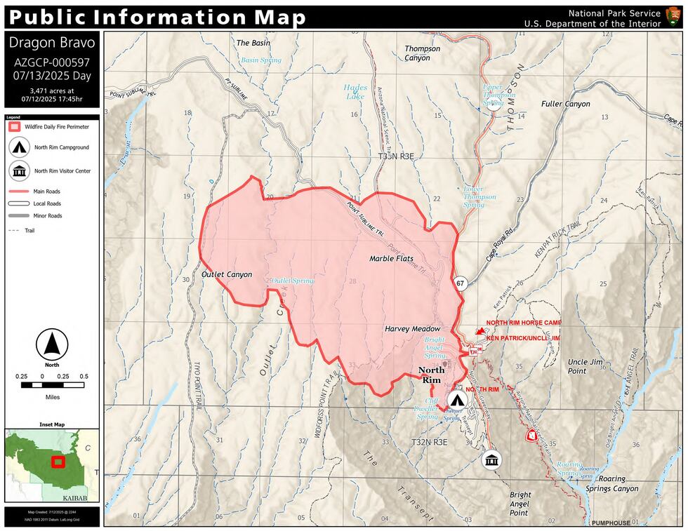 Map shows the perimeter of the Dragon Bravo Fire, burning near the Grand Canyon North Rim(Grand Canyon National Park)