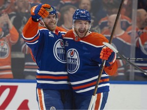 Connor McDavid (97) and Zach Hyman (18) of the Edmonton Oilers, celebrate the Oilers second goal in the first period against the Dallas Stars in the Western Conference Final in Edmonton on Sunday, May 25, 2025. Photo by Shaughn Butts /Postmedia