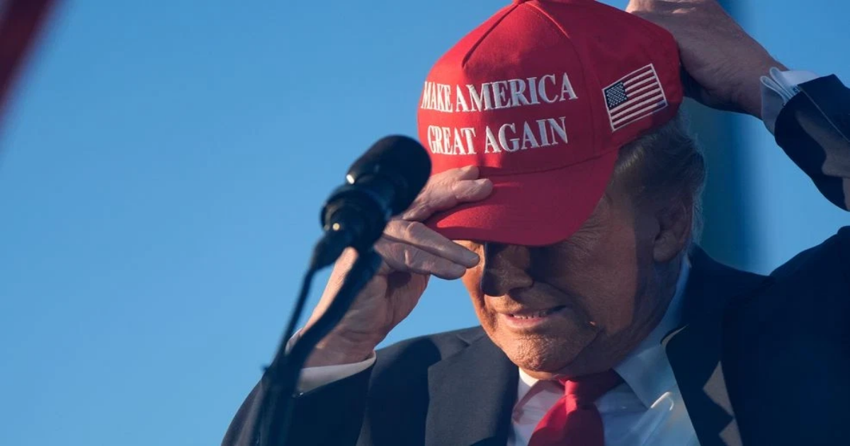 Republican presidential nominee former President Donald Trump puts on a campaign hat as he speaks at a campaign rally at the Calhoun Ranch, Saturday, Oct. 12, 2024, in Coachella, Calif. (AP Photo/Alex Brandon)