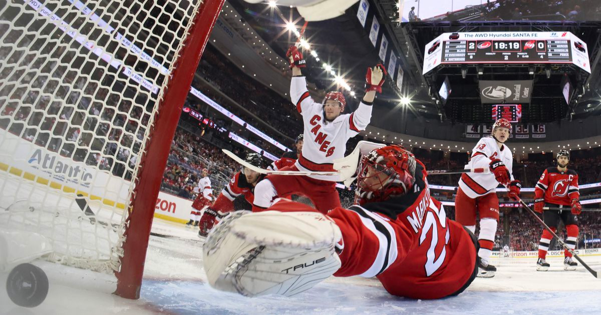 The New Jersey Devils nearly took the lead in the first minute when Hischier deflected a Dougie Hamilton shot. Frederik Andersen made the save, and the Carolina Hurricanes dug it out of netfront traffic. The Hurricanes, on the other end, took the lead when Andrei Svechnikov shot through a screen and beat Jacob Markstrom by the glove. Just 52 seconds into the game, the Devils were behind.