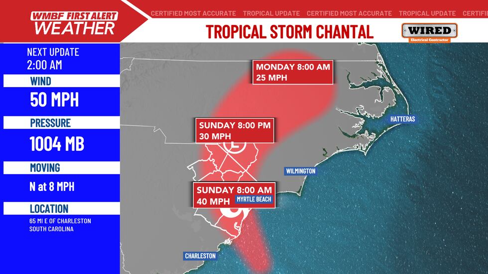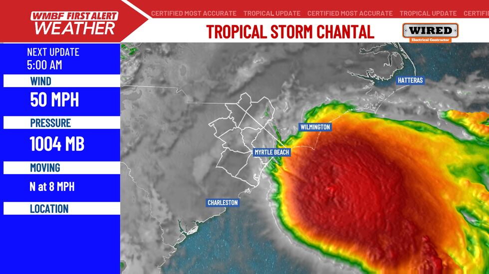 MYRTLE BEACH, SC (WMBF) – Tropical Storm Chantal is moving towards the South Carolina coastline, making landfall late tonight into early Sunday morning.