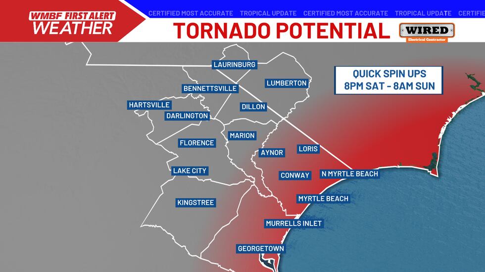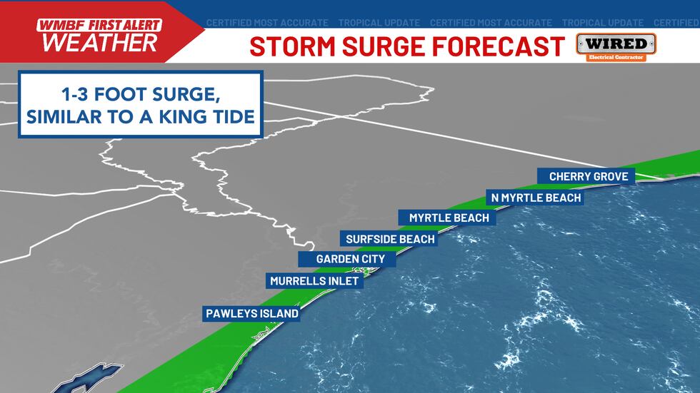 An onshore flow ahead of landfall will increase the wave heights and push water into the Grand Strand. IF this lines up with the strongest winds near high tide, expect a storm surge potential for 1 to 3 foot, similar water levels to a normal king tides. High tide is set for 4:36 AM Sunday.