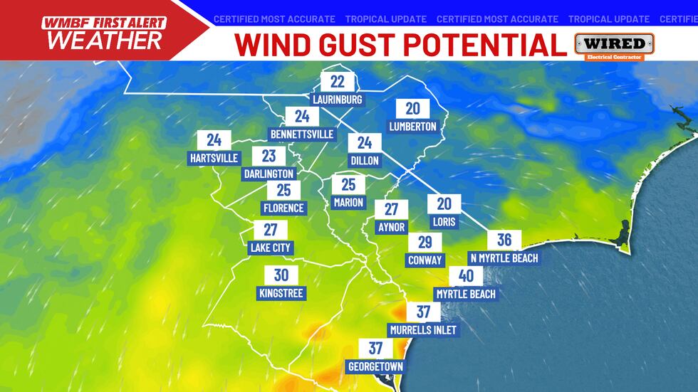 Wind gusts of minimal tropical force – near 40 mph will be possible near the beaches late this evening and overnight. No major wind issues are expected.(WMBF)