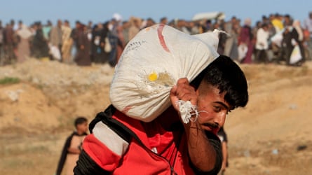 A man carries a sack as people gather to collect food supplies from the US-backed Gaza Humanitarian Foundation in Khan Younis. Photograph: Hatem Khaled/Reuters