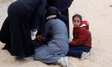Mourners at a funeral for people killed by Israeli strikes, held at Nasser hospital, Khan Younis. Photograph: Hatem Khaled/Reuters