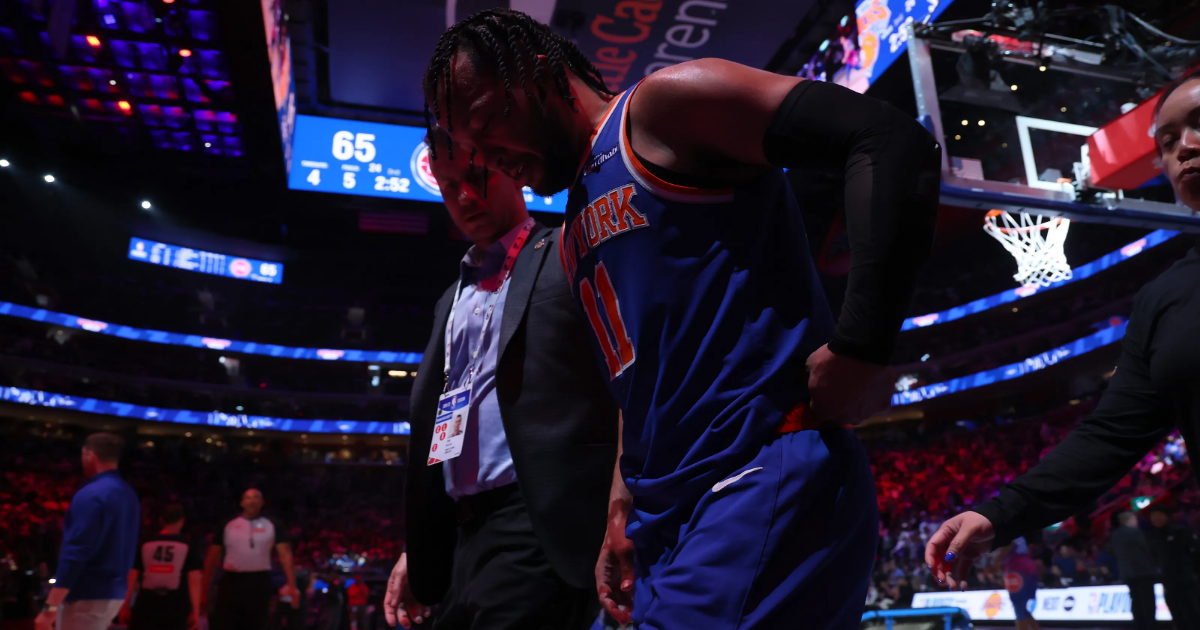During the play, which came with fewer than three minutes to play in the third quarter, Brunson was battling with Pistons guard Dennis Schröder for the loose ball. As both players lunged for it, Brunson crumpled onto the floor and immediately grabbed his right leg. Brunson slid over to the scorer’s table and lay there for a moment, in obvious discomfort. Eventually, Knicks center Karl-Anthony Towns helped Brunson get to his feet, but Brunson was unable to put weight on the leg, and immediately fell back to the court.