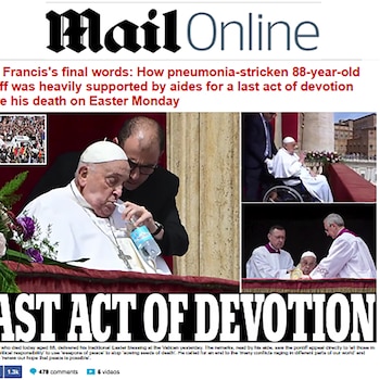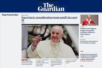 The Guardian y Daily Mail, del Reino Unido, también le dieron gran espacio a la noticia en sus sitios web. El primero tituló: “El Papa Francisco, pionero pontífice jesuita, muere a los 88 años”, mientras que el segundo resaltó: “Las últimas palabras del Papa Francisco: cómo el pontífice de 88 años, afectado por una neumonía, recibió un fuerte apoyo de sus asistentes para un último acto de devoción antes de su muerte el lunes de Pascua“.