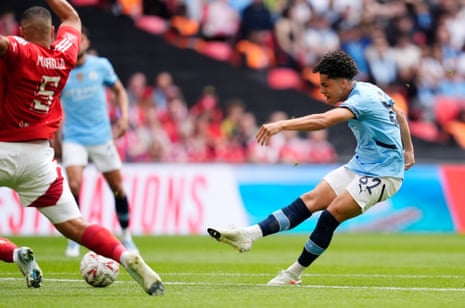Rico Lewis scores their side’s first goal. Photograph: Nick Potts/PA