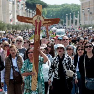 Item 1 of 13 A woman carries a cross as people walk, after the death of Pope Francis was announced by the Vatican in a video statement, as seen from…