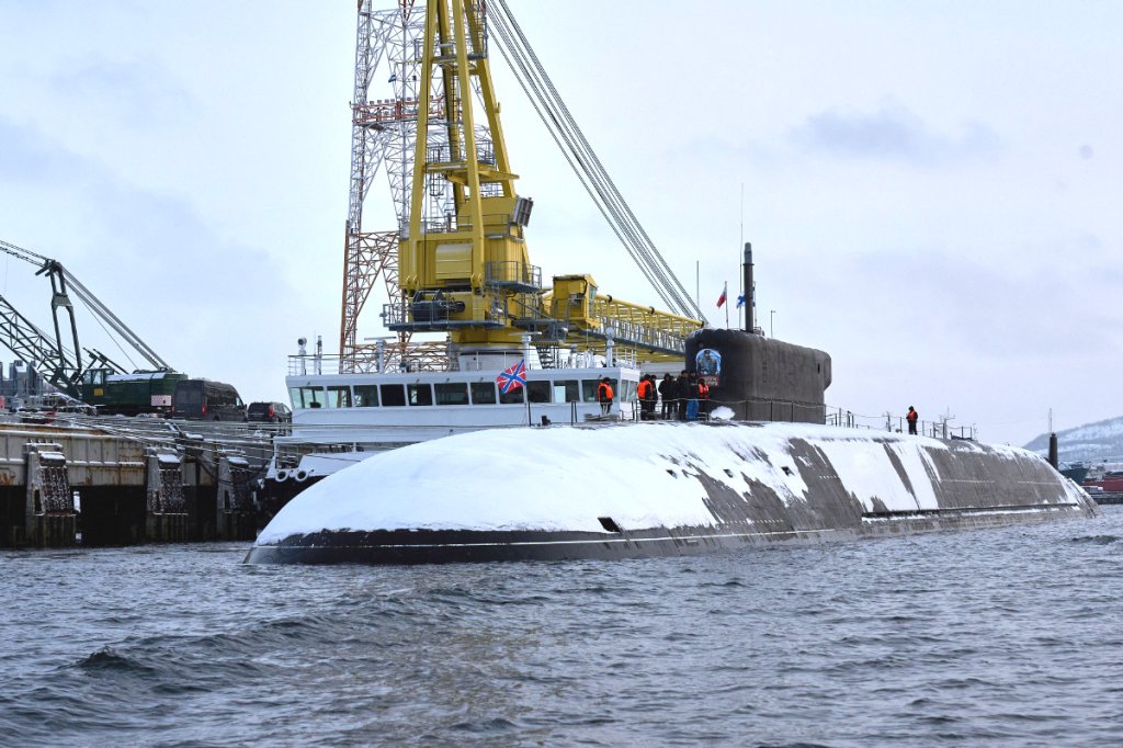 The Oscar II class guided missile submarine Tver seen sitting pierside at its base in Kamchatka. Russian Ministry of Defense