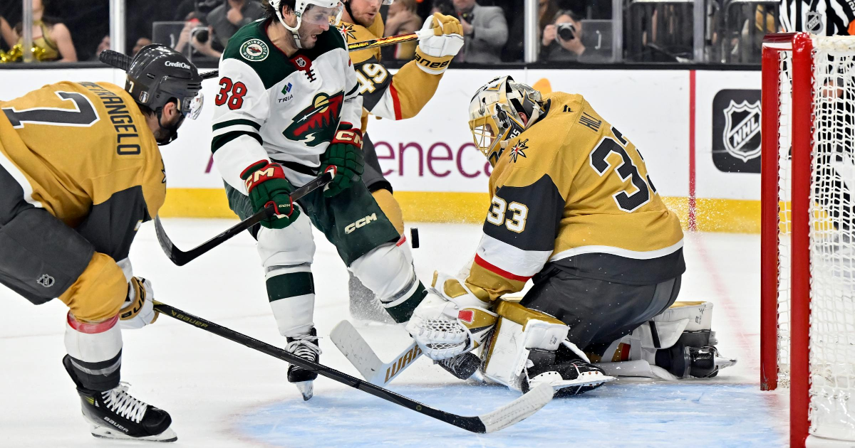 Matt Boldy tied the game 2-2 by driving hard to the net with Vegas defenseman Alex Pietrangelo in his hip pocket. Boldy fended him off and maneuvered to get a shot on net for his fifth goal of the series.