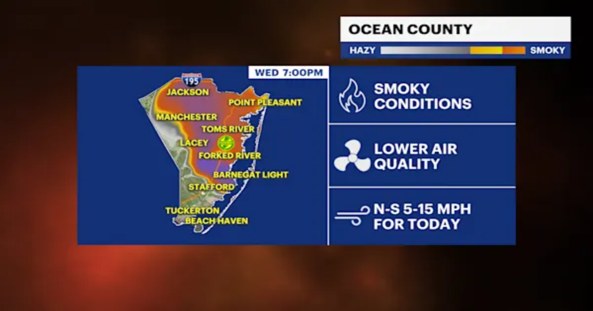 Wildfire smoke in Ocean County is moving southwards along the coast this morning into Atlantic and Cape May counties due to a light northerly wind. As temperatures warm this afternoon a sea breeze slowly develops and by noon, the wind will begin to waft the smoke northward into Monmouth County.
