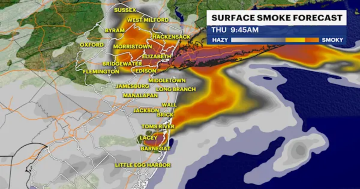 Wildfire smoke from Ocean County wafts across the Garden State creating a hazy sky and smoky odor.